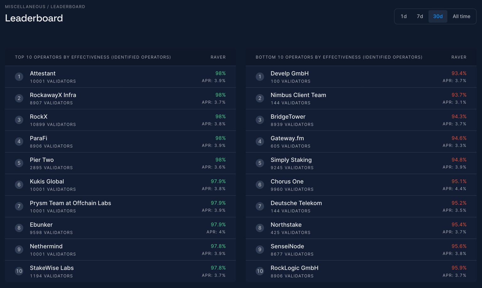 calculation in this section, we are only considering validators that have been active for more than 30 days so that we reduce noise. This is equally true for Trending validator indices, as well as for operator groupings (we exclude validators younger than the 30day window from the calculation).