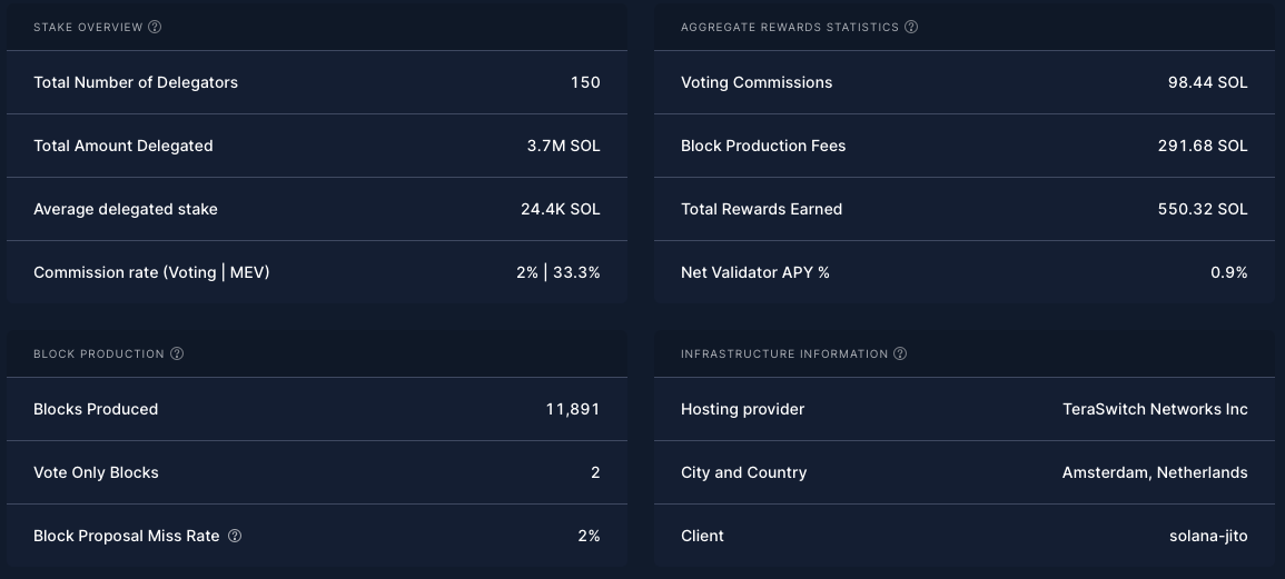 The commission rate being charged by this validator to delegators. This is further separated into two: the commission rate specific to voting rewards and the one specific to MEV rewards through Jito.Aggregate Rewards Statistics