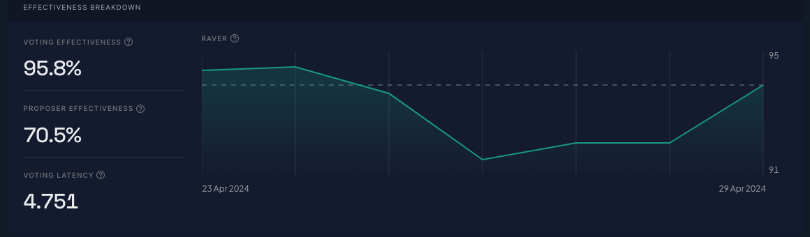 The number of correctly blocks voted on by a validator out of the total canonical blocks in the network, modulated (i.e. divided) by their voting latency.Proposer Effectiveness