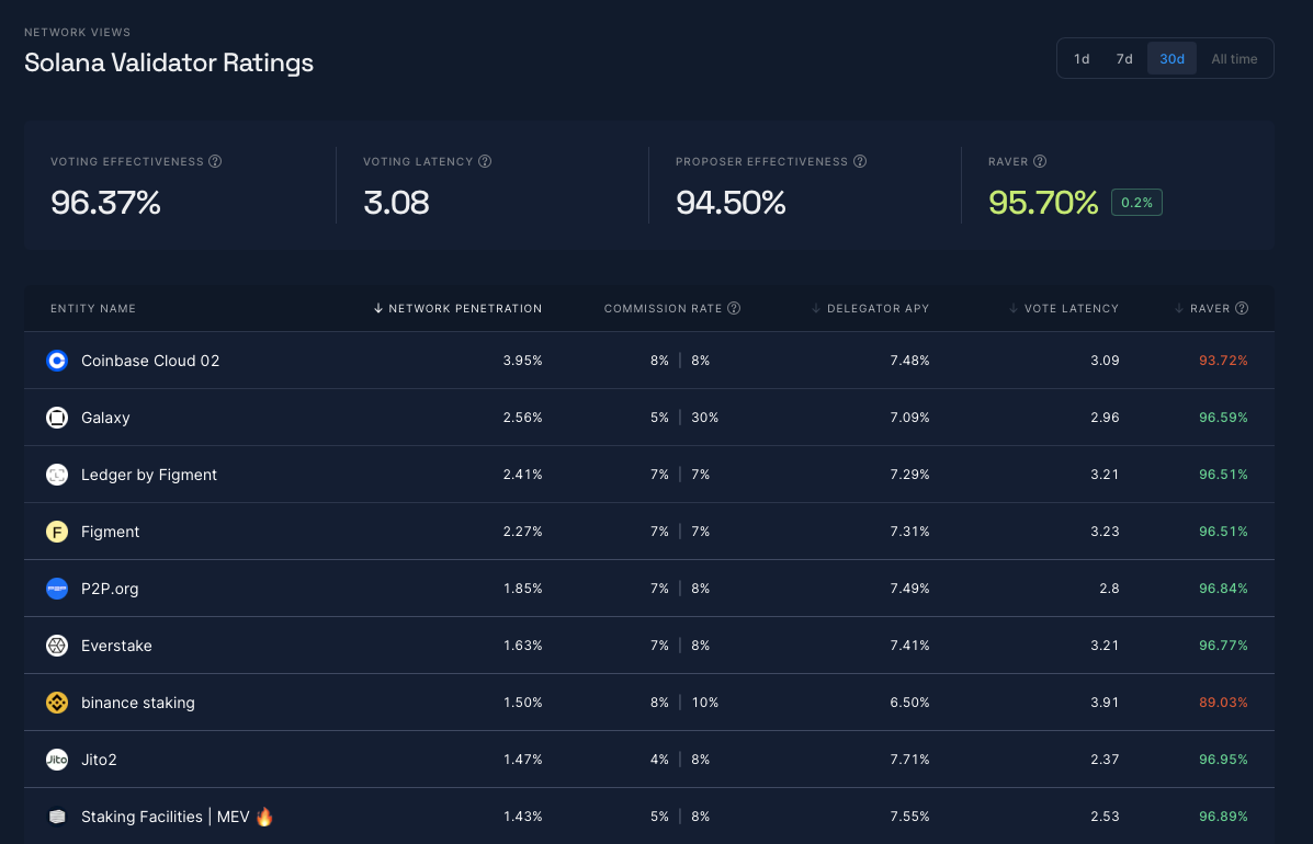 The Rated model of validator performance for the Solana network. The colour coding in each of these values hints to the relative performance of the entity.For more information on how this is computed and the methodology behind it, please refer to the Solana Validator Effectiveness Rating page. You can also learn more about how we rank for relative performance via Rating percentiles.