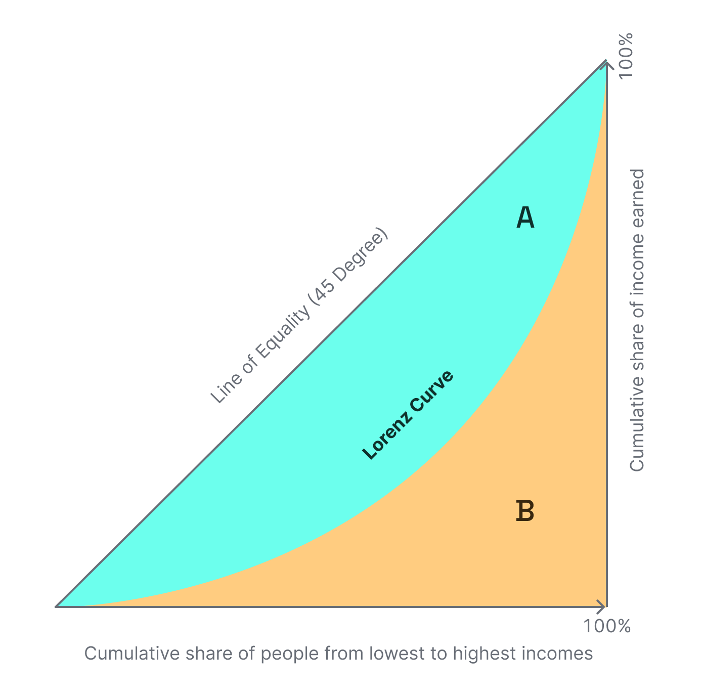 formula for measuring the Gini, where B is the area under the Lorenz curve such that: